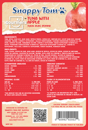 Tuna, Apple, Cassia Gum, Carrageenan, Guar Gum, Choline Chloride, Taurine, Vitamin E Supplements, Calcium Pantothenate, Thiamine Mononitrate (Vitamin B1), Zinc Oxide, Ferrous Sulfate, Manganese Sulfate, Vitamin A Supplement, Niacin Supplement (Vitamin B3), Biotin, Pyridoxine Hydrochloride (Vitamin B6), Riboflavin Supplement (Vitamin B2), Vitamin K3 Supplement, Folic Acid, Vitamin D3 Supplement, Sodium Selenite, Potassium Iodide.
